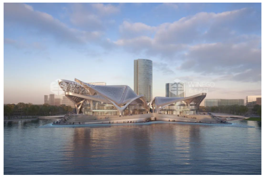 珠海金灣航空城市民藝術中心由國際著名的ZaHa Hadid(扎哈·哈迪德)建筑事務所設計,靈感源自中國南方起飛的候鳥。遠看像展翅的飛鳥,飛翔在海闊天空中,追逐時間的痕跡;俯瞰又像飽滿的風帆,寓意金灣城市新中心建設即將蓄勢騰飛、揚帆遠航。