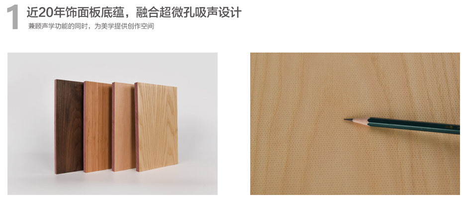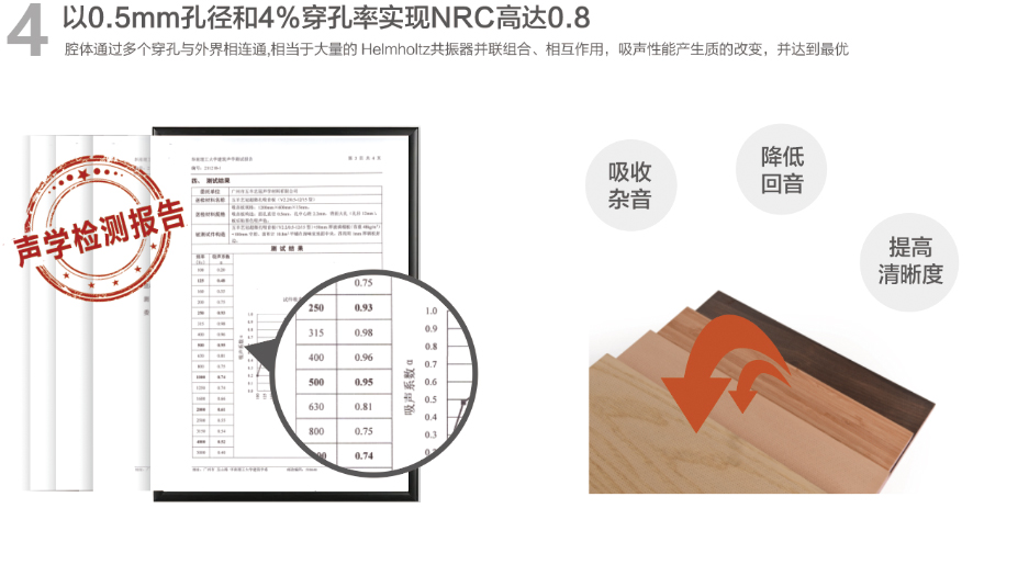 超微孔吸音板基于亥姆霍茲共振器原理,以0.5mm孔徑和4%穿孔率,實現 NRC高達0.80、平均吸聲系數高達0.70,對中低頻吸聲效果尤佳,是裝飾和聲學功能完美結合的產品。