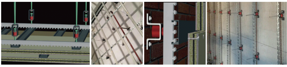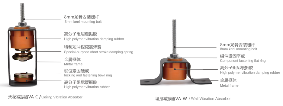 天花減振器和墻面減振器采用高分子阻尼緩振膠,100%原生膠鑄造,耐老化時間及阻尼系數是翻新膠件的五倍以上,從硬件的品質上保證了隔聲效果永久性和安全性。天花減振器是剪切吊頂天花與原基礎樓層天花結構傳聲的有效途徑。墻面減振器適用于墻身增強隔聲結構層安裝固定,在聲波照射面與原基礎墻體間形成隔斷層。