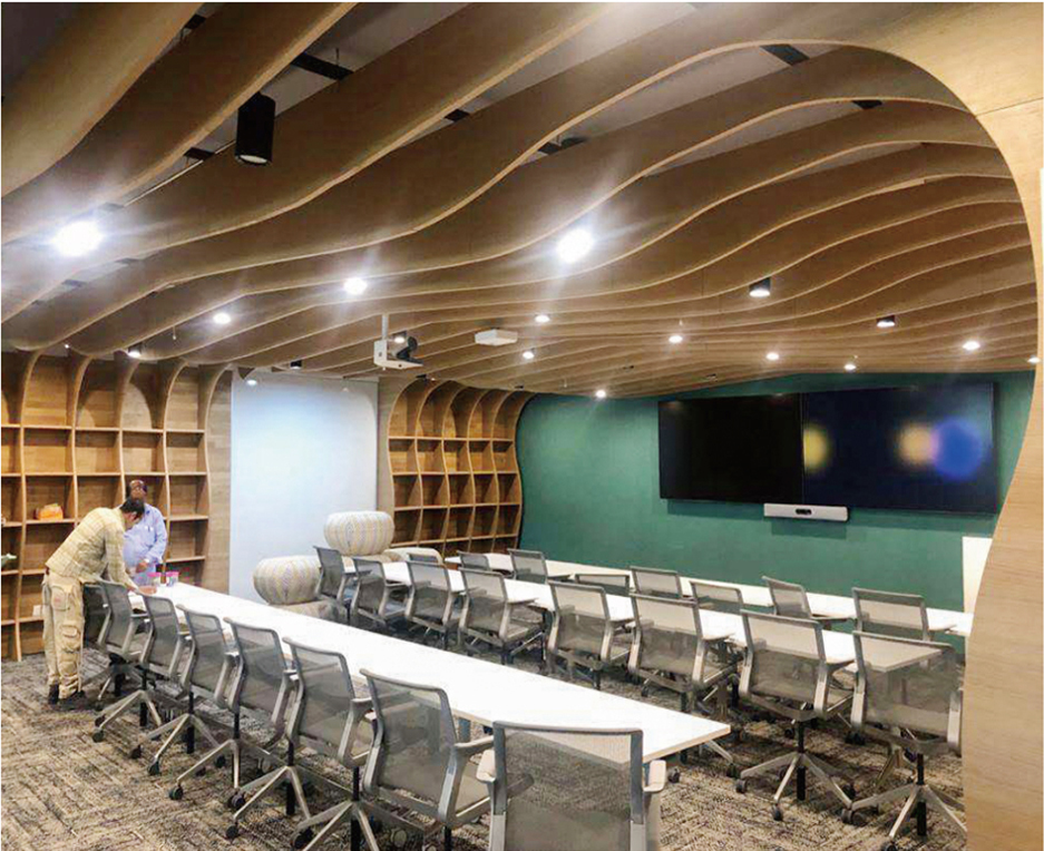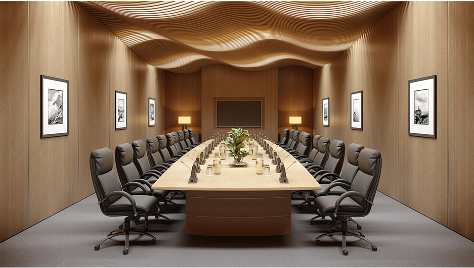 天花:聲學材料的放置天花板為了達到最好的效果,建議采用全覆蓋的懸浮聲學天花板。這種類型的天花板提供了最高程度的吸收整個頻譜。在普通視頻會議室這樣的小房間里,深頻率(低沉的聲音)尤其成問題。吊頂也是解決這個問題的理想方式。如果吊頂不實用或不可取,則可以采用其他解決方案,如自由懸掛吸音模塊單元。