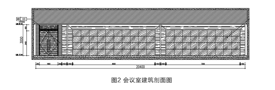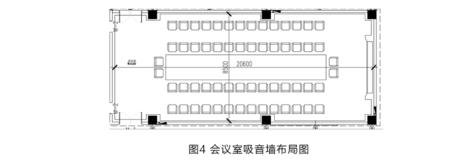 會議室兩兩相對的側墻互為平行面,需至少對其中一面墻體作強吸聲處理,以防止產(chǎn)生顫動回聲聲學缺陷。本案會議室吸音墻(紅色線標記)布局圖如下: