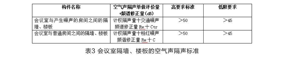 根據(jù)等傳聲量設計原則,會議室墻的隔聲量比門窗高出10dB即可;即門的修正計權隔聲量Rw+C需要大于35dB,建議使用成品隔聲門。外窗的修正計權隔聲量Rw+Ctr需要大于35dB,建議使用雙層中空玻璃如5+12+5的構造。