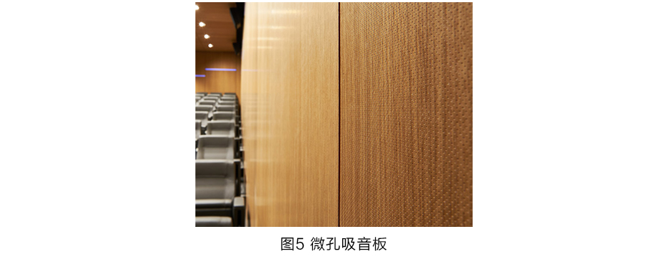 吸音墻位置設置微孔吸音板PAV4/0.7-15,板后填50mm48K玻璃棉板。采用微孔吸音板的設計同時兼顧聲學和美學的要求,好看且聲音清晰。