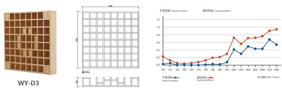 木質(zhì)擴(kuò)散體是一種不規(guī)則的平面設(shè)計(jì),目的是在反射中產(chǎn)生擴(kuò)散,它產(chǎn)生的聲音非常豐富而圓潤(rùn),混響聲似乎是從許多方向從側(cè)向、從頭頂以及從前方到達(dá)聽(tīng)眾的,可顯著地改善廳堂的音質(zhì)條件。