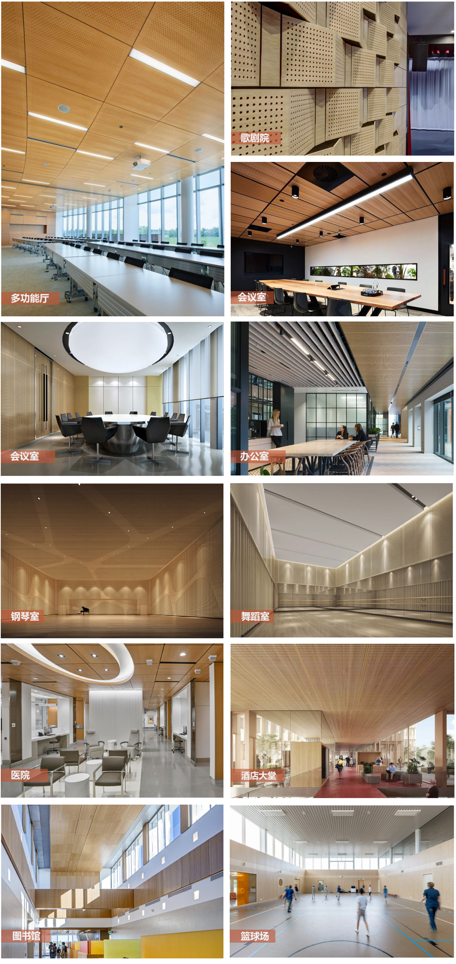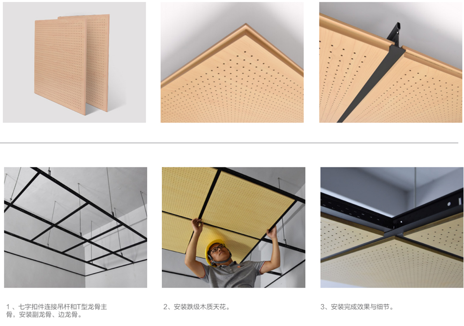 孔木吸音板正面背面穿孔的圓孔結構是根據聲學原理科學計算,對中低頻吸音效果明顯。豐富的飾面顏色以及材料選擇,不僅滿足客戶多樣化的聲學及裝飾需求,也給客戶提供環保防火安全保證。